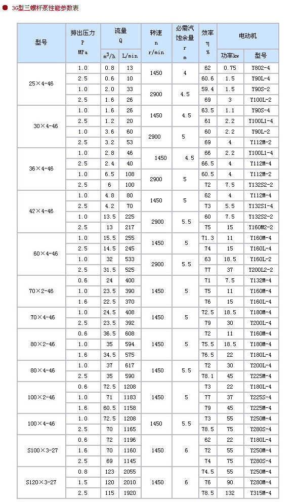 3GR三螺桿泵所輸液體為各種不含固體顆粒,3gr三螺桿泵,3g三螺桿泵無(wú)腐蝕性油類(lèi)及類(lèi)似油的潤(rùn)滑性液體,所輸液體粘度為1.2-100E(3.0-760cst),高粘度液體亦可通過(guò)加溫降粘后輸送