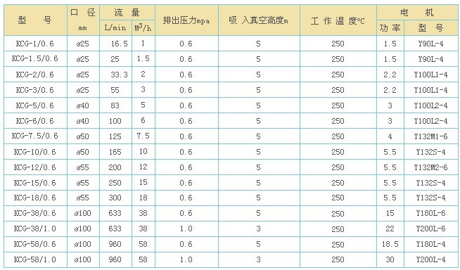 KCG高溫齒輪油泵,KCG高溫泵用途塑料橡膠加工工業(yè),紡織印染工業(yè),涂料工業(yè),木材加工工業(yè),食品業(yè)、造紙印刷等液態(tài)熱載體加熱載體加熱傳輸?shù)雀鞣N工業(yè)。 KCG高溫齒輪油泵,KCG高溫泵應(yīng)用范圍 KCG高溫齒輪油泵適用于輸送不含固體顆粒和纖維,無腐蝕性的高溫液體,介質(zhì)溫度可達250℃,粘度為5-1500cst。結(jié)構(gòu)型式 KCG高溫齒輪油泵由齒輪、軸、泵體泵蓋、軸端密封等零部件組成,所有零件均選用合適的耐溫材料制造。KCG高溫齒輪油泵,KCG高溫泵內(nèi)運轉(zhuǎn)零件均利用其輸送的介質(zhì)潤滑KCG高溫齒輪油泵,KCG高溫泵配有保護閥,KCG高溫齒輪油泵,KCG高溫泵可防止超載對泵和電機造成損壞。常用KCG高溫齒輪油泵性能參數(shù)表